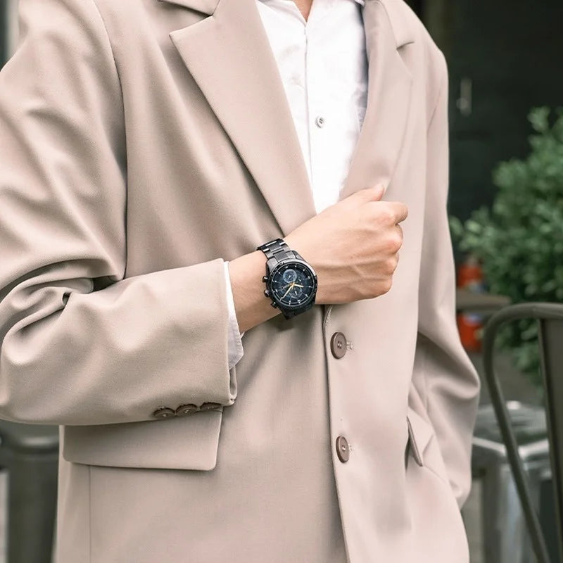 Relógio Masculino de Luxo em Aço Inoxidável: Elegância e sofisticação em cada detalhe. Este relógio foi projetado para homens que apreciam qualidade e estilo. Com uma caixa robusta e pulseira em aço inoxidável de alta resistência, ele oferece durabilidade e um acabamento impecável. Seu design moderno e versátil combina perfeitamente com qualquer ocasião, seja para eventos formais ou uso diário. Além disso, conta com um visor resistente a arranhões e é à prova d'água, garantindo performance e classe em todas as situações. Um símbolo de bom gosto e exclusividade